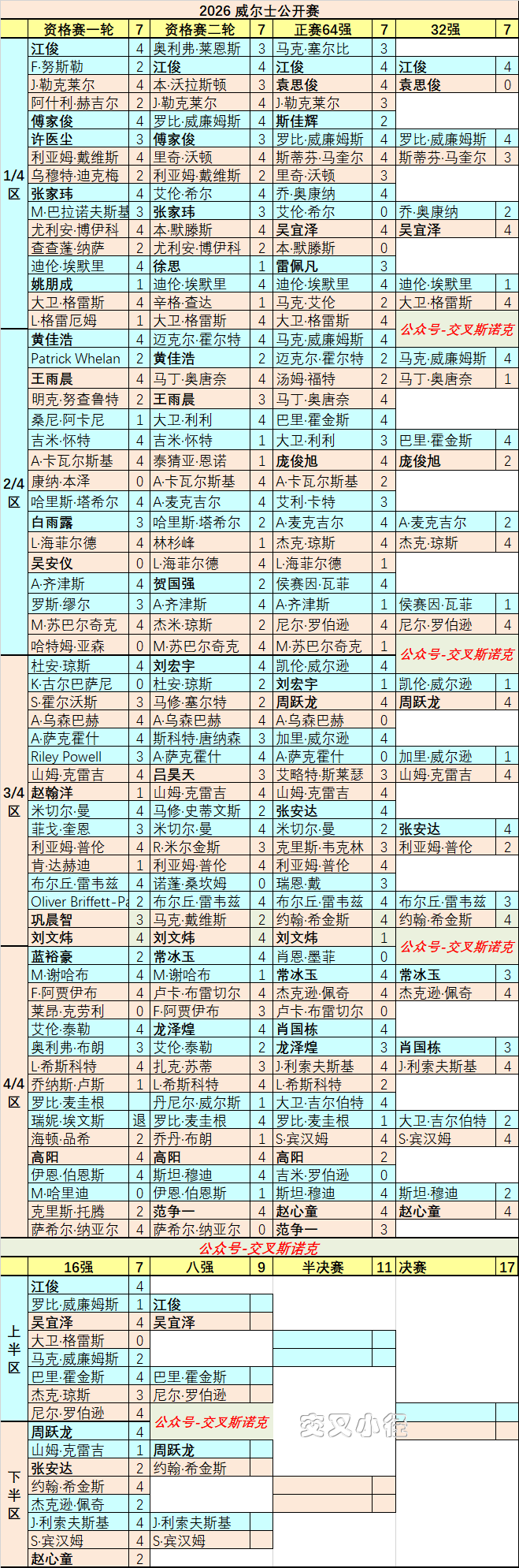 16强尚有6位TOP16球员,威廉姆斯和赵心童掉队。
