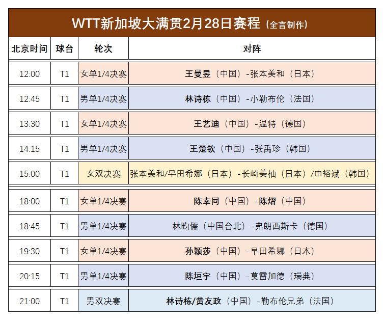 WTT新加坡大满贯2月28日赛程:王曼昱再战张本!孙颖莎阻击早田
