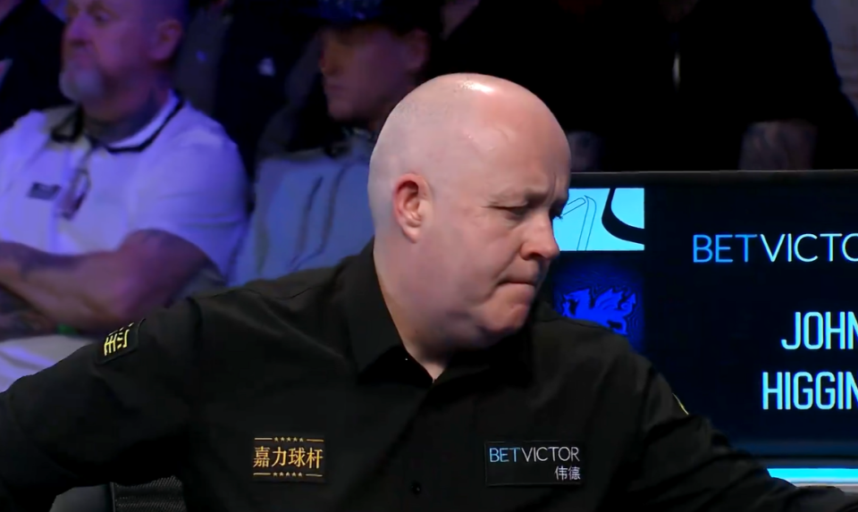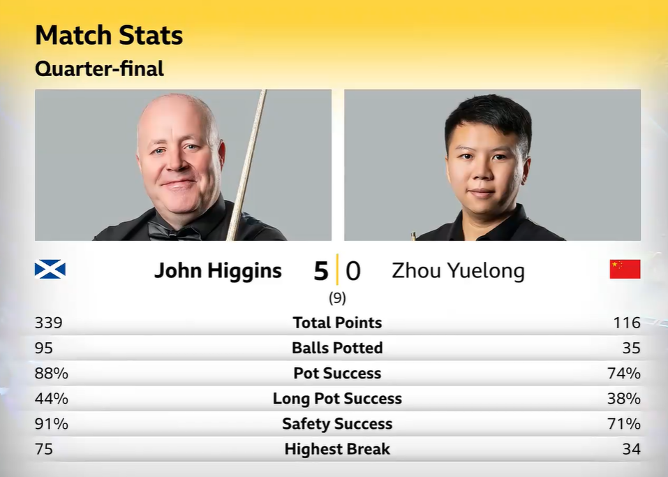 同时段,周跃龙对阵希金斯,比赛一边倒。前3局,进程很慢,希金斯在防守上压制,3-0领先。第4局,希金斯单杆75分制胜,4-0到赛点。