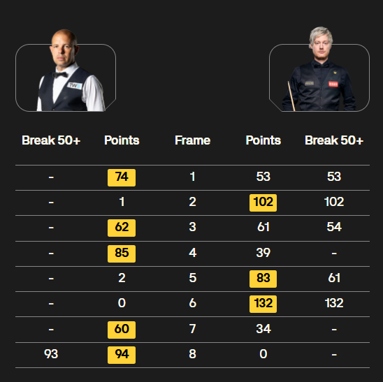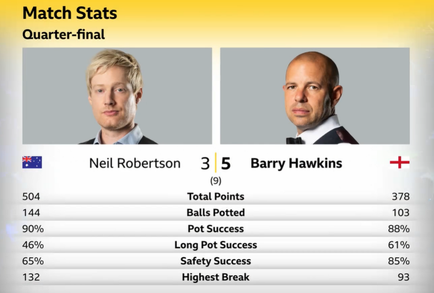 短休后,罗伯逊打出一杆60+和一杆破百,扳平比分。第7局,罗伯逊出现多个失误,霍金斯4-3先到赛点。第8局,霍金斯斯诺克换来机会,一杆93分,5-3终结比赛。
