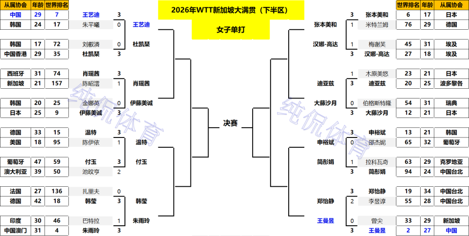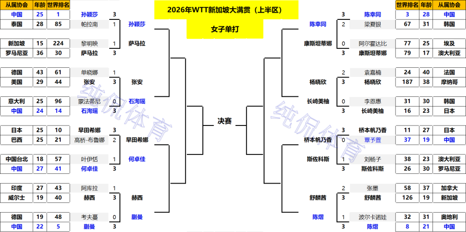 北京时间2月27日晚,2026年WTT新加坡大满贯结束了正赛第7天的争夺,目前单打八强正式出炉(详细签表如下图所示)!男单八强国乒占3席,女单八强国乒占5席;日乒男单参赛6人全军覆没;韩国单打参赛14人仅剩张禹珍独苗,下面带来详细信息。