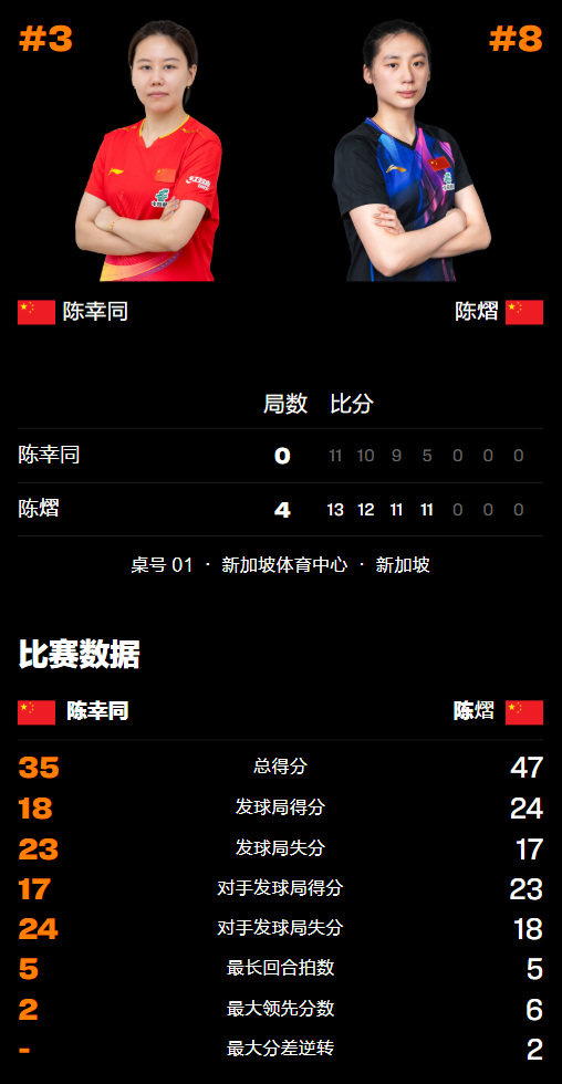 2026年2月28日晚,乒乓球WTT新加坡大满贯赛再次爆发国乒内战,国乒小将陈熠以较大优势4-0淘汰世界冠军陈幸同晋级女单4强,后者也由此而成为中国队第4位出局的主力运动员(注:此前蒯曼2-3输日本的早田希娜、林诗栋2-4输法国的小勒布伦、王艺迪2-4输德国的温特),详细战况请看下文。