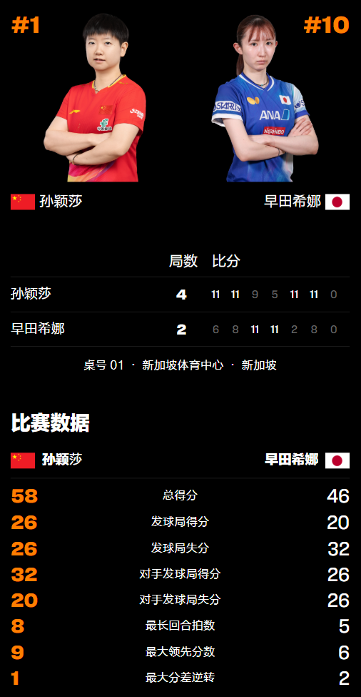 2026年2月28日晚,乒乓球WTT新加坡大满贯赛结束最后一场女单1/4决赛,头号种子孙颖莎恶战6局4-2淘汰连破国乒防线的日本劲敌早田希娜,由此而连续第18次战胜对方保持不败。