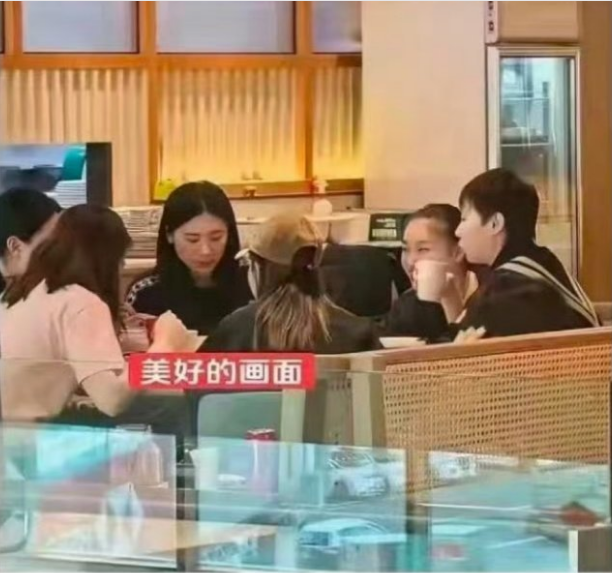 王曼昱和队友们吃饭,一边吃一边聊天,笑容灿烂。