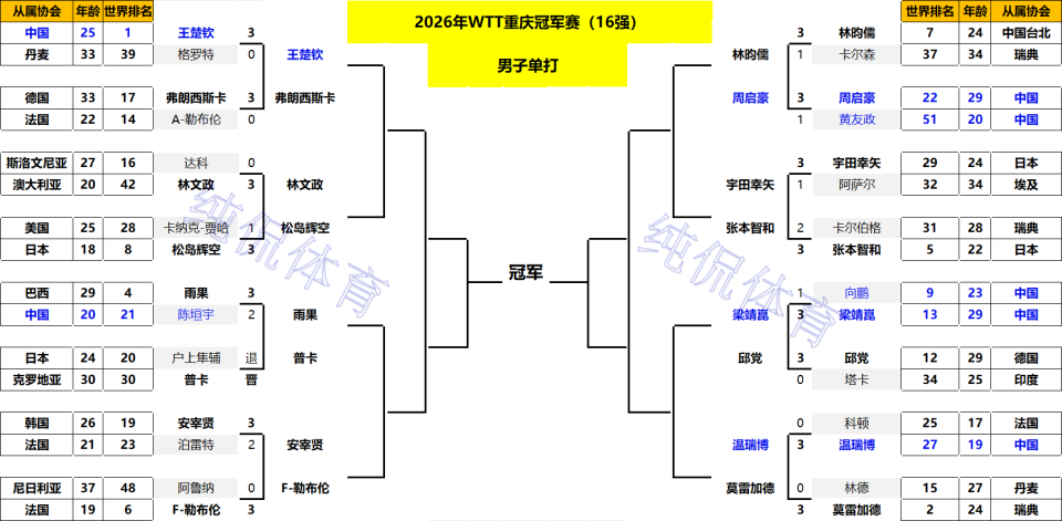 北京时间3月12日,2026年WTT重庆冠军赛进入第3个比赛日的争夺,在白天场次结束之后,男、女单16强正式出炉!本人详细整理了对阵签表,如下图所示。国乒单打14人已有4人出局;日乒8人有5人晋级;韩国男、女单均剩独苗,下面带来详细信息。