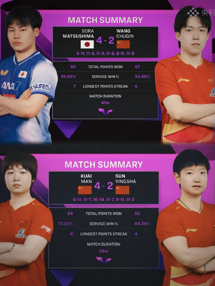 男单世界第一王楚钦,2-4不敌日本18岁小将松岛辉空;女单世界第一孙颖莎,2-4输给队友蒯曼。两位头号种子,同一天,同一站,双双无缘四强 。