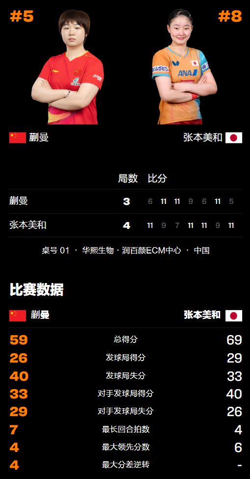 第七局蒯曼依旧率先丢分0-3落后于人,随后抓住运气球机会赢回2分,中间段张本美和逐渐放开手脚取得4分左右的优势,蒯曼3-7落后追至5-7但很快又5-10出现5个赛点,再输1分后以5-11结束战斗无缘登顶为王。