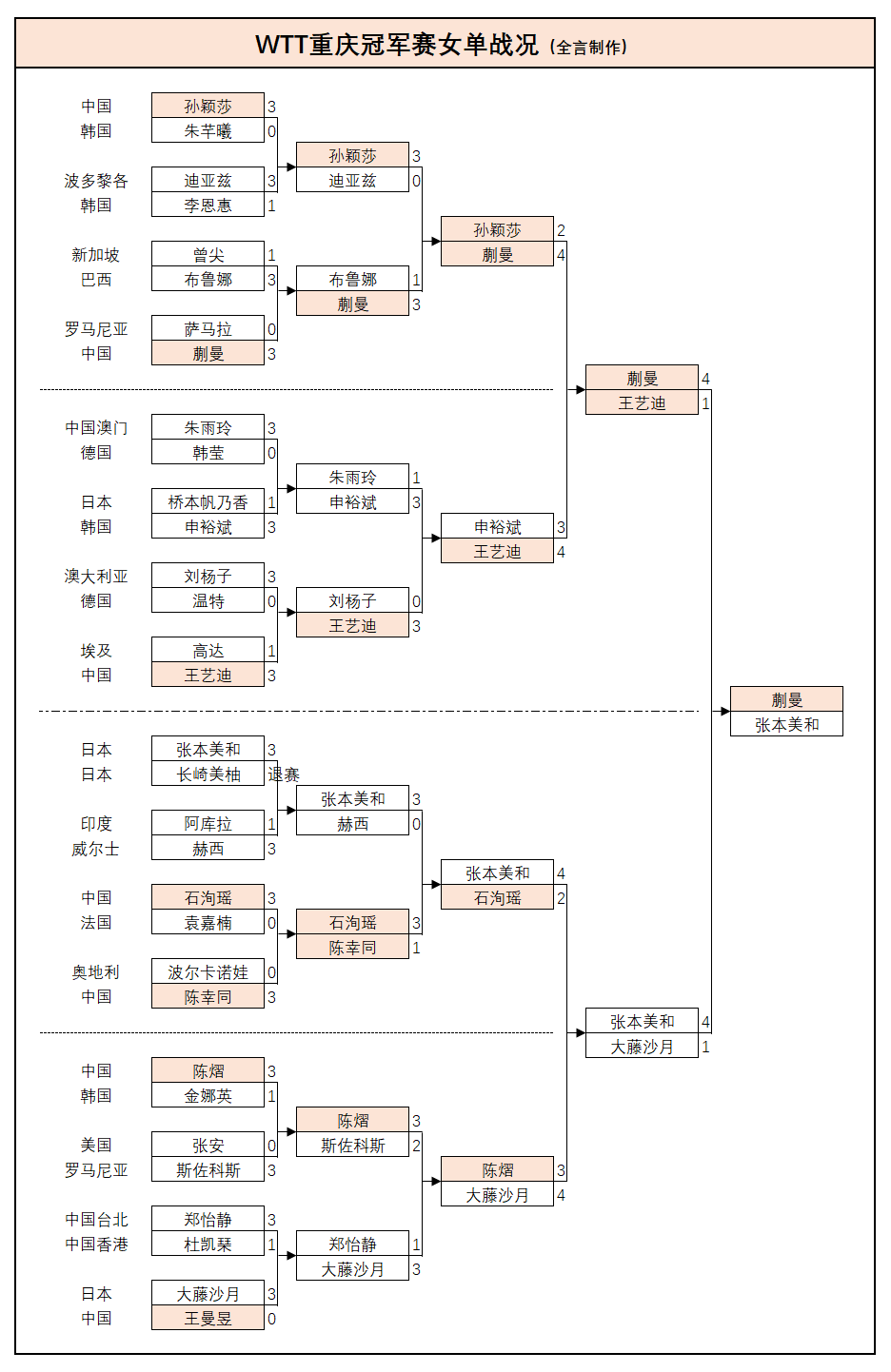 张本美和:3-0长崎美柚(日本,退赛)、3-0赫西(威尔士)、4-2石洵瑶(中国)、4-1大藤沙月(日本)。