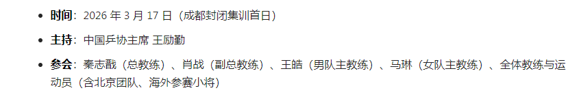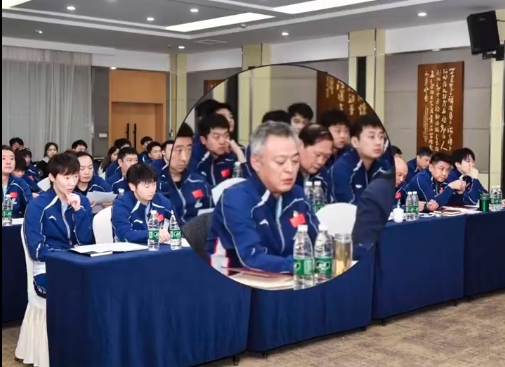 会议的主题是:专题学习 + 赛前誓师,以两会精神为引领,直面重庆赛失利,部署 40 天封闭集训,备战澳门世界杯(3.30—4.5)与伦敦世乒赛(4.28—5.10)