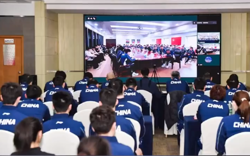 重庆冠军赛结束,16号国乒大部队就赶往成都集结,开启40天的封闭训练。成都距离重庆不远,大部队很快集结完毕, 第二天便召开了大会。现场还采用了北京、成都两地视频连线,全体教练员、运动员参会。