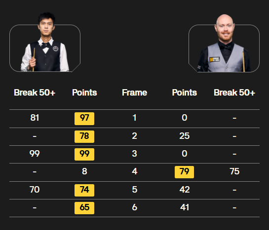 前4局,艾伦只进了两颗球,得了3分。短休后,第5局,吴宜泽错失提前结束比赛的机会,有点无心恋战的艾伦,单局逆转挽救一个赛点。第6局,吴宜泽单杆53分后失误,但艾伦再送机会,吴宜泽5-1终结比赛,大胜艾伦。