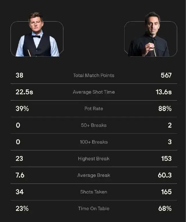 -单局比分:算上对手罚分,奥沙利文169-0零封对手,首局直接打崩对手心态。