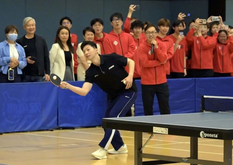 研讨会结束后,马龙还与香港理工大学乒乓球校队成员交流,切磋球技,霍启刚和郭晶晶也参与其中,与同学们一同上阵对阵马龙。