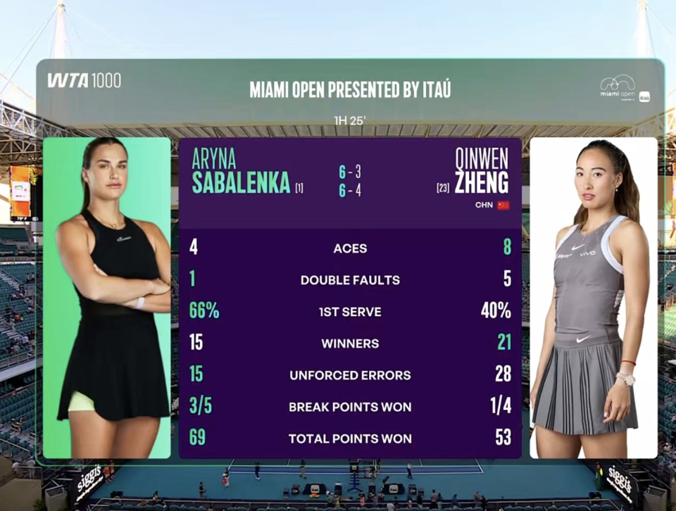 今日的比赛中,郑钦文很快就感受到了萨巴伦卡的残暴!第一盘比赛,尽管郑钦文完成了一次破发,但她自己被破发2次。3-6,郑钦文输掉了首盘。偏低的一发成功率是郑钦文落败的主要原因。