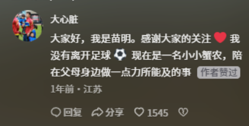 苗明一度因“职业球员退役养大闸蟹”出圈,源于一位自媒体大哥的探访,他在老家帮家人一起打理蟹塘,每天早上6点半给蟹塘投喂,半夜起来抓蟹打包……