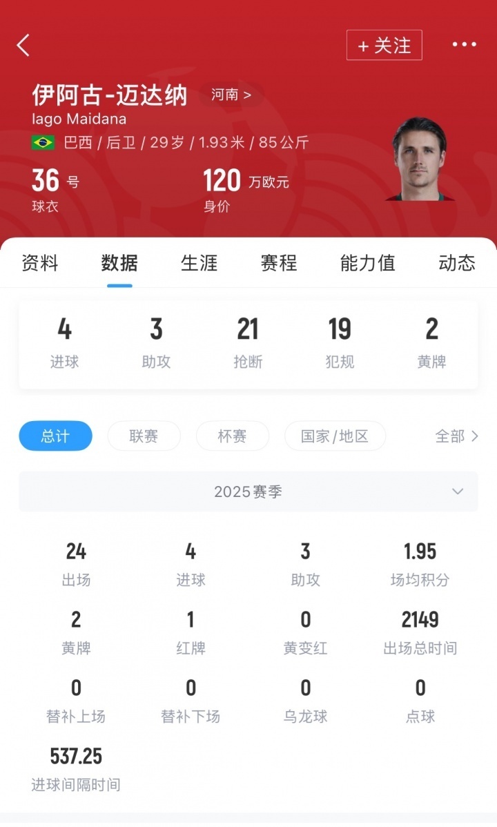 迈达纳现年29岁,巴西后卫,身高1米93。迈达纳去年2月自由身加盟河南,本赛季代表球队出场24次,贡献4球3助。目前他德转身价为120万欧元。
