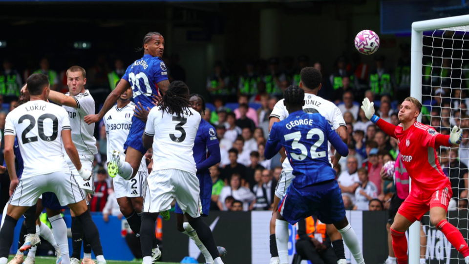 第43分钟,切尔西获得角球,恩佐开出,富勒姆后卫的头球解围砸在阿达拉比奥尤的身上,皮球稍稍高出。