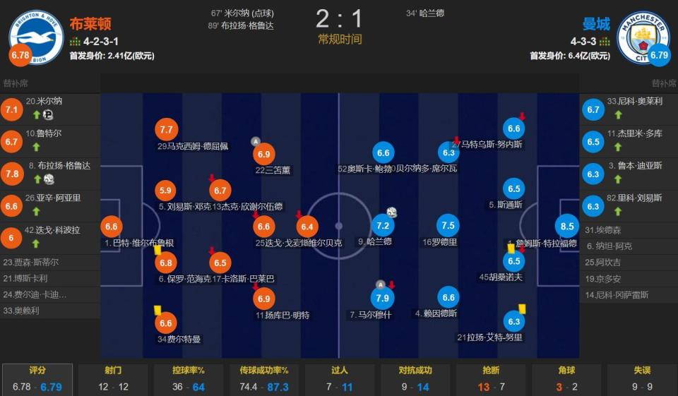 上半场,哈兰德错失单刀后破门,马尔穆什送助攻,曼城半场1-0领先;下半场,布莱顿高压逼抢战术,把曼城按在半场狂揍,努内斯禁区里手球送点,39岁米尔纳点射时隔6年英超再次破门,格鲁达打入绝杀进球。