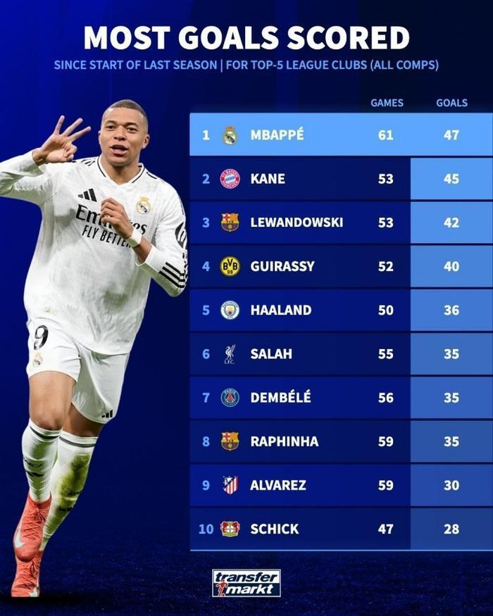 可没想到的是,他们居然遭遇到了赛季大退步,各项赛事没有一个奖杯进账的情况,让姆巴佩格外伤心,也被外界球迷予以了巨大的批评。毕竟在他来之前他们是冠军的,在他来之后却什么都没有了,似乎问题都积攒到了姆巴佩个人的身上。可是姆巴佩的进球效率,又很是不错,从上赛季加入到皇马,到本赛季他已经完成了47粒进球。这个数据横扫欧陆其他选手,哪怕是发挥极其出色的哈里-凯恩,也比他少了2粒进球的。