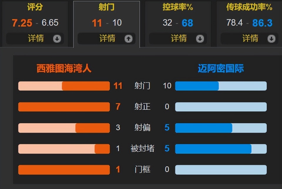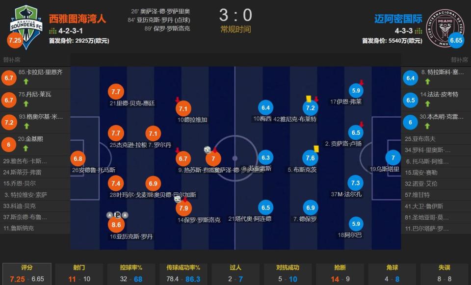 全场比赛,迈阿密国际的控球率高达68%,但是伪传控,一共有10次射门,比西雅图海湾人少了1次,迈阿密国际全场0射正,西雅图海湾人7次射正打入了3球。