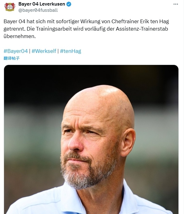 北京时间9月1日,前德甲冠军勒沃库森俱乐部官方宣布,55岁的荷兰主帅滕哈格已经正式下课。俱乐部一线队训练工作,暂由助理教练团队接管。