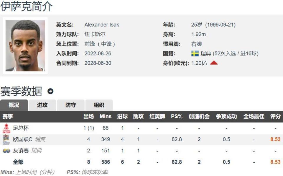 伊萨克现年25岁,身高1.92米,右脚技术流中锋,与哈兰德同为北欧中锋,但伊萨克有着更为细腻的脚下技术。伊萨克缺的是超级平台,加盟利物浦之后他有望冲击足坛顶流以及更多的冠军荣誉。伊萨克上赛季34场英超23球6助,仅次于利物浦的萨拉赫屈居英超银靴,如今利物浦签下伊萨克,英超金靴携手银靴冲锋陷阵。伊萨克德转估价1.2亿欧元,与纽卡斯尔的合同至2028年,现有周薪12万英镑。