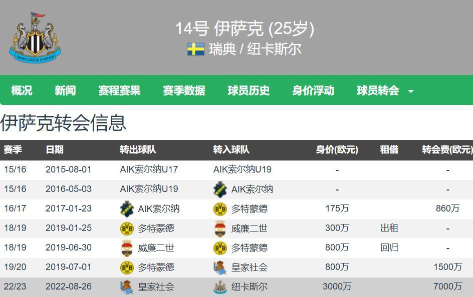 伊萨克于2022年夏窗以7000万欧元的转会费从皇家社会加盟纽卡斯尔,至今各项赛事109场62球11助,随队夺得2024-25赛季的联赛杯冠军。