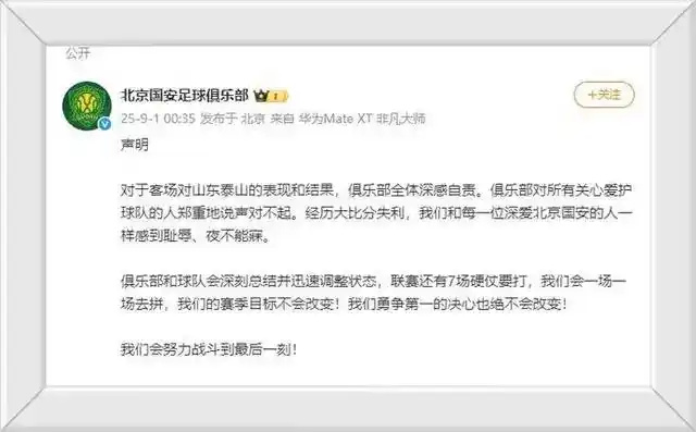 为安抚球迷,国安俱乐部在凌晨0点35分发出官方声明,为球队的0-6惨败道歉。