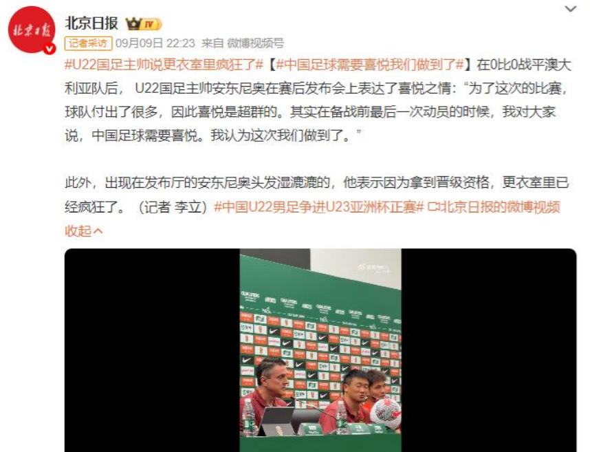 安东尼奥:“安东尼奥:我们赛后爆发出了巨大的喜悦,整场比赛非常艰苦,这种喜悦也是非常巨大的。整场来讲澳大利亚对我们展示了非常大的尊重,不仅来自于比赛结果,也来自于场上的表现,因为对手也在害怕,他们也有自己紧张的地方。“