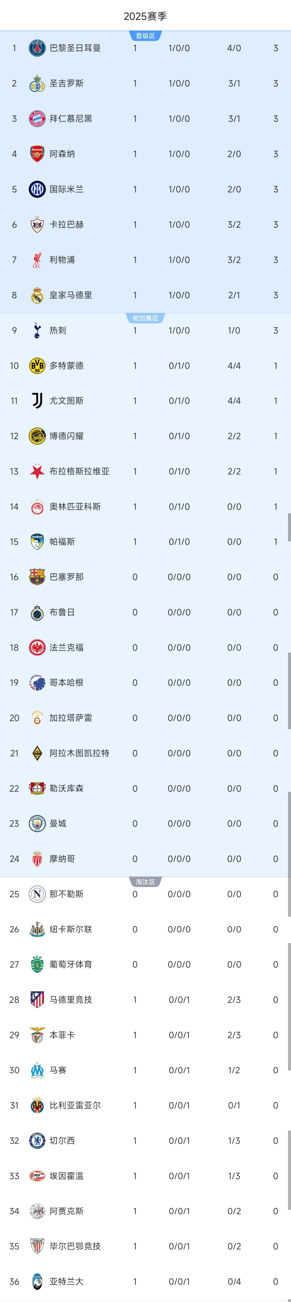 同轮其他焦点赛事中,利物浦3-2险胜马德里竞技,范戴克在补时阶段完成绝杀;国际米兰客场2-0完胜阿贾克斯,恰尔汉奥卢两度助攻图拉姆头球破门;卫冕冠军巴黎圣日耳曼4-0大胜亚特兰大,展现出强大的统治力。本轮战罢,巴黎圣日耳曼凭借净胜球优势暂居积分榜首位。欧冠积分榜: