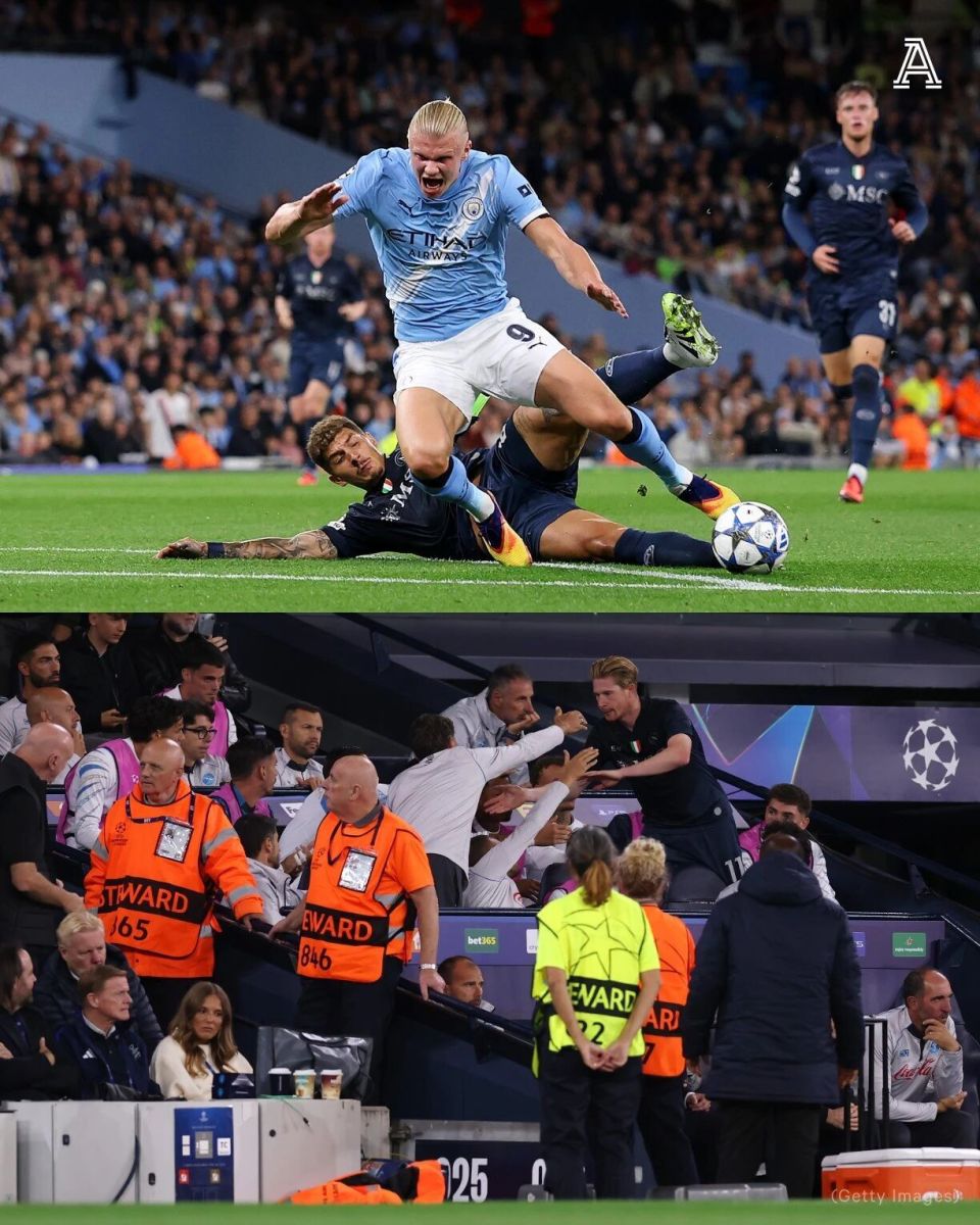 第17分钟,那不勒斯场上队长迪洛伦佐在禁区外下铲,破坏了哈兰德单刀机会,VAR介入后他被直红罚下。那不勒斯场上人数减少到10人后,主帅孔蒂决定换上一名后卫加强防守,他最终选择将德布劳内换下。