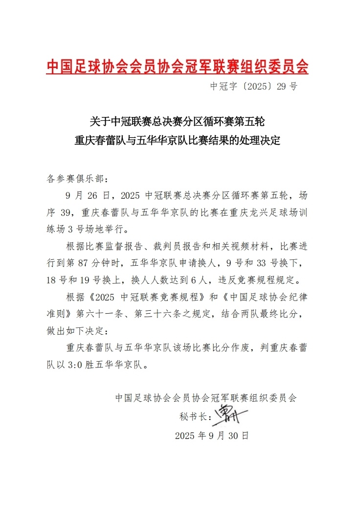 北京时间9月30日,中冠组织委员会发布公告,由于在与重庆春蕾的比赛中,五华华京队换人人数达到6人,违反竞赛规程规定,该场比赛五华华京被判0-3负。而原本这场赛果是五华华京3-1击败重庆春蕾,如此一来球队因为自己的业余失误,痛失到手的3分。