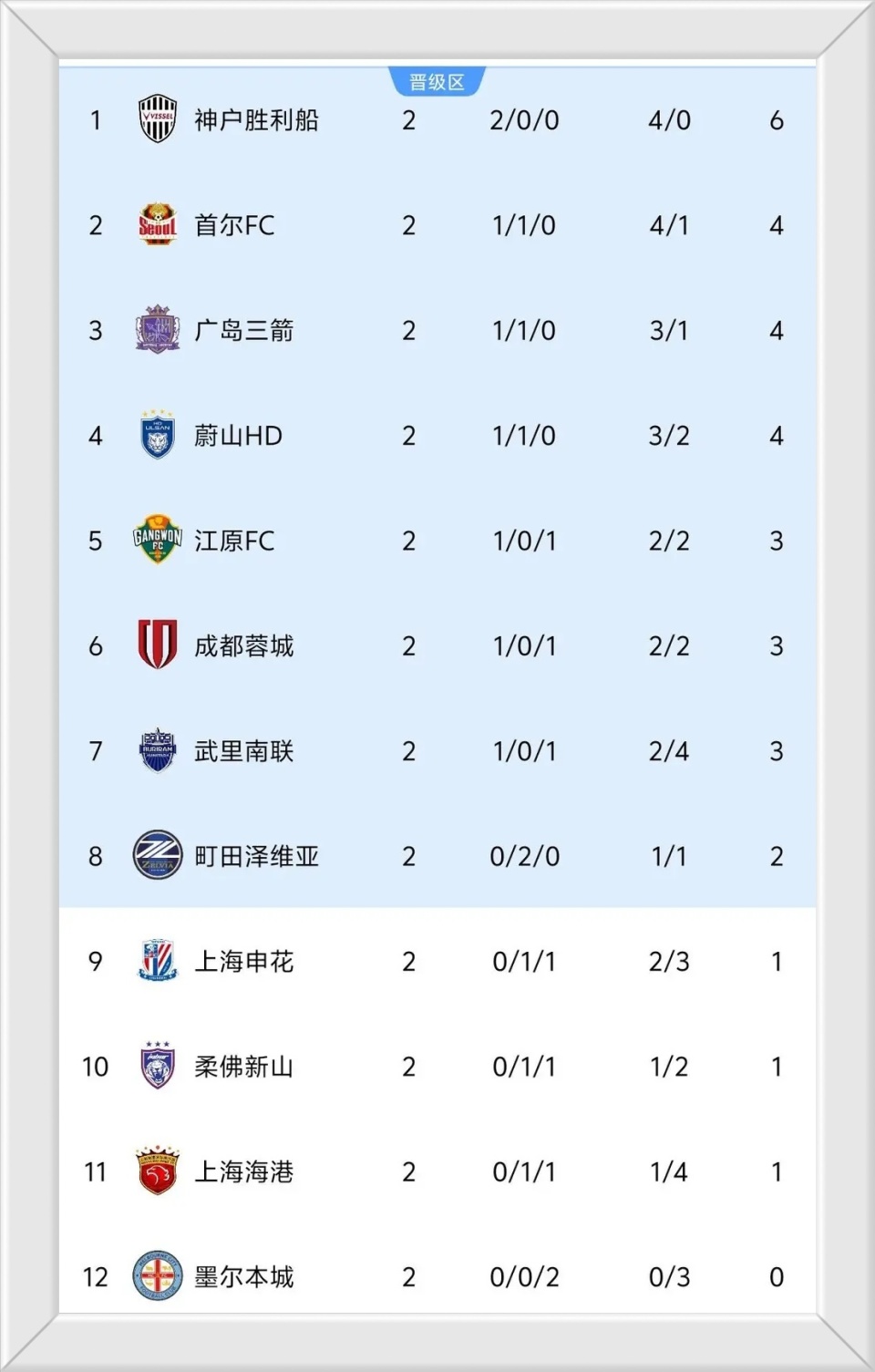 而随着申花1-1、神户胜利船1-0绝杀,第二轮亚冠最新完整积分榜出炉。