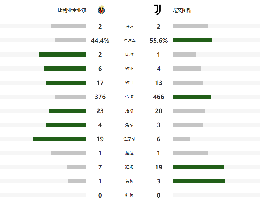士气大振的尤文,7分钟之后反超比分,小孔塞桑前场抢断之后,一条龙杀入比利亚雷亚尔禁区,随后抽射破门,将比分反超为了2-1,不甘心在主场被逆转的黄色潜水艇,最后时刻也发起了猛攻,比赛最后时刻韦加利用角球机会头球破门,将全场比分定格为了2-2平。