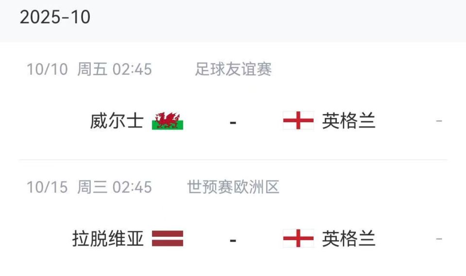 英格兰在10月份只有1场世预赛的比赛,北京时间10月15日凌晨02:45,客战拉脱维亚;以及北京时间10月10日凌晨02:45,友谊赛客战威尔士。