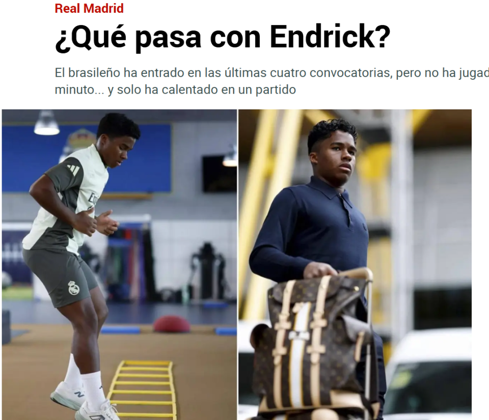 《马卡报》指出,现在恩德里克能做的是保持耐心,然后通过认真训练来等待属于自己的时机。另一方面他也必须做好离开皇马的准备,如果事情没有朝着他期待的方向发展,那么离开皇马为了2026年世界杯而战,也是可以理解的。