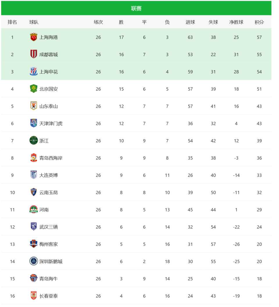 山东泰山迎来3连平,总积分提升到43分,排名超越津门虎又回到积分榜第五。云南玉昆连续5轮不胜,目前积32分仍排名第十,本赛季保住前十机会较大。