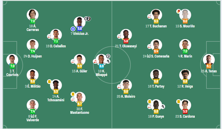未登场替补:13-卢宁、43-梅斯特雷、4-阿拉巴、9-恩德里克、16-贡萨洛·加西亚、17-劳尔·阿森西奥、20-弗兰·加西亚
