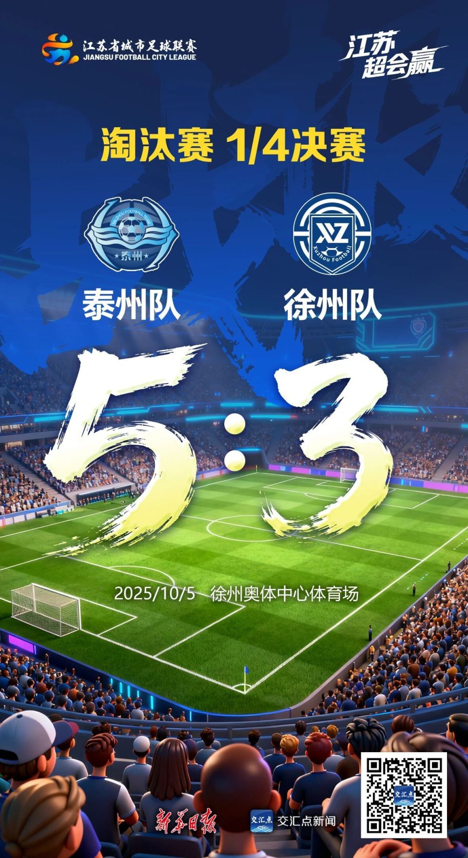10月5日晚19:35,“苏超”淘汰赛第二场徐州队VS泰州队在徐州奥体中心体育场打响。
