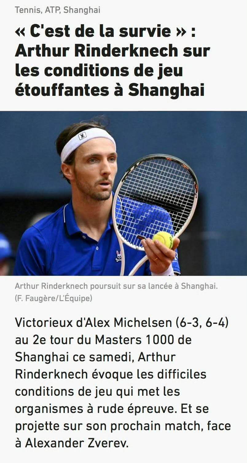 昨天,在上海大师赛第二轮以6-3 6-4击败米克尔森后,法国选手林德克内希在接受《队报》采访时评价上海的湿热天气,并吐槽中国大城市污染严重。