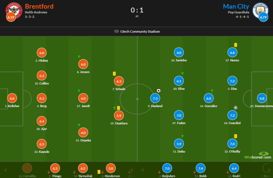 本场比赛两支球队都没有创造出太多有威胁的进攻机会,哈兰德上半场为球队打入全场唯一进球,多纳鲁马则在下半场扑出对手单刀,最终帮助曼城在客场1-0击败了小蜜蜂布伦特福德。
