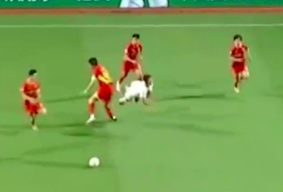 随即,重庆队门将发动进攻。重庆队快速反击。在中线附近,广西队的45号球员黄威迎面上抢重庆队的球员。他直接撞向了带球的对手,他和对手都倒在了地上。不过,倒地的重庆队员并无大碍,而黄威则伤势严重,无法站起来。