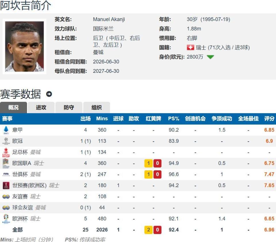 现年30岁的阿坎吉,身高1.88米,右脚球员,能踢中卫和边后卫,德转身价2800万欧元,国米1500万欧元买断还是非常划算的。阿坎吉租借加盟国米之后,4场意甲全部首发,欧冠出场2次,其中1次首发。阿坎吉用6场比赛就征服了国米高层和球迷,如今蓝黑军团已经决定买断。曼城不要,国米当宝,树挪死人挪活,祝福阿坎吉在国际米兰赢得新生。