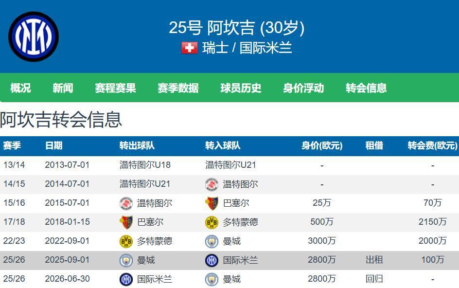 阿坎吉于2022年夏窗以2000万欧元的转会费从多特蒙德加盟曼城,蓝月生涯136场5球3助,随队夺得1次欧冠、2次英超、1次世俱杯、1次足总杯冠军。阿坎吉于今年夏窗以100万欧元的租借费加盟国际米兰1年,合同含有1500万欧元的选择性买断条款。