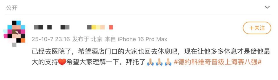 38岁的德约,像一个斗士,勇敢地战斗在上海大师赛的赛场之上。10月7日晚间,在打完与穆纳尔的比赛后,德约说不出话,谢绝了现场采访,并直接前往医院检查。过去这3天,他的体能几乎到了极限。