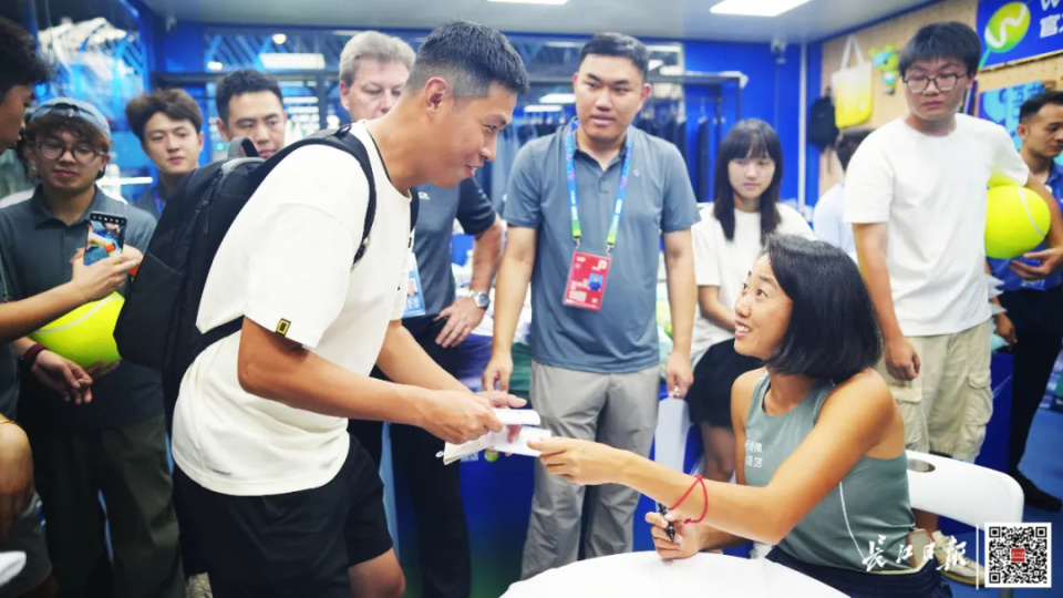 10月7日,中国金花张帅取得武网正赛首轮比赛胜利后,在武网嘉年华活动现场为球迷签名,与球迷合影交流互动。记者何晓刚 摄
