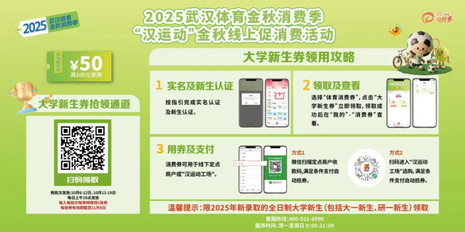 为了给体育消费“添把火”,武汉还启动金秋线上促消费活动,精准发放总价值1000万元的“武网宠粉券”和“大学新生券”,可以购买用品、看赛事、进场馆,满足不同人群的消费需求。