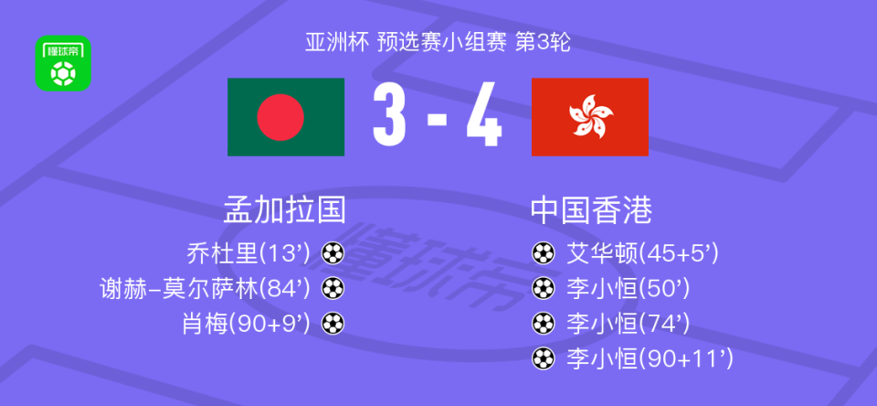 北京时间10月9日亚洲杯 预选赛小组赛 第3轮,孟加拉国对阵中国香港。孟加拉国乔杜里破门,谢赫-莫尔萨林破门,肖梅破门。中国香港艾华顿破门,李小恒帽子戏法。最终比分孟加拉国 3-4 中国香港。