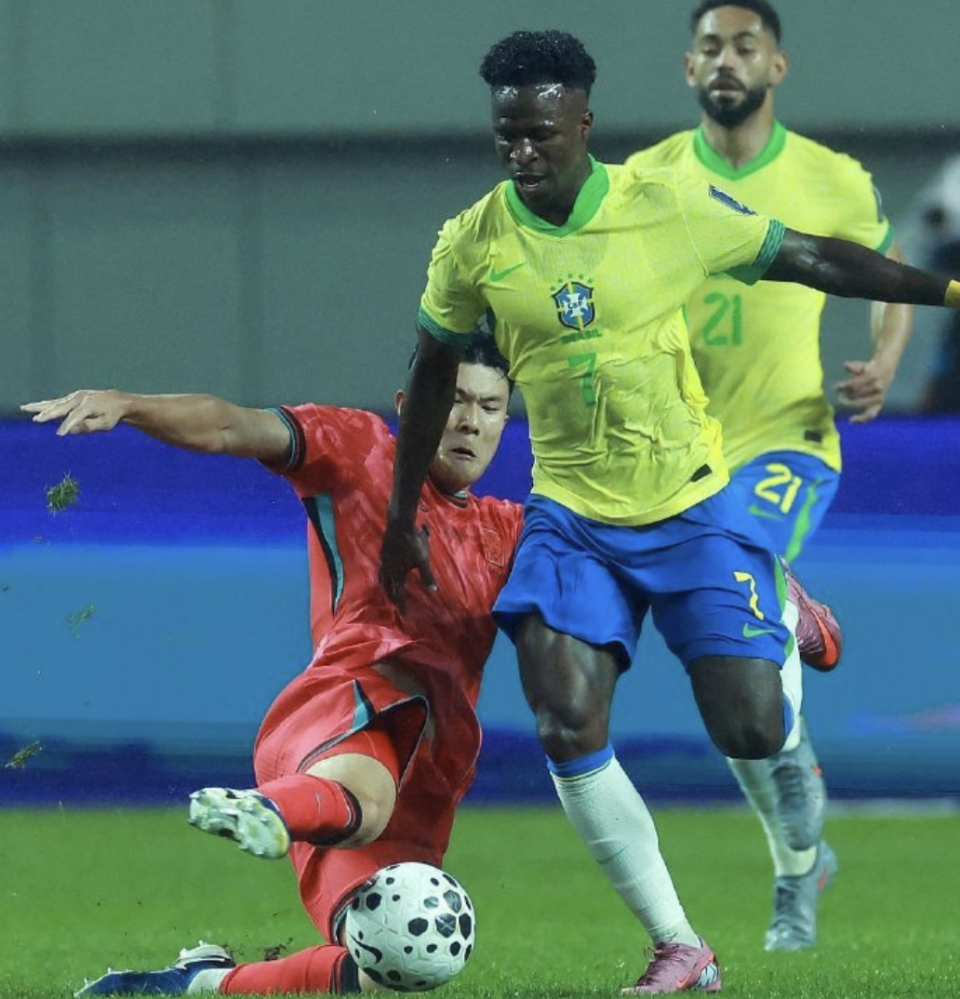 第77分钟,巴西后场打反击,库尼亚大师级直塞球,绕过了韩国队的整条防线,维尼修斯带球单刀突进。到了禁区里,维尼修斯戏耍韩国后卫,随后射门得分,5-0!
