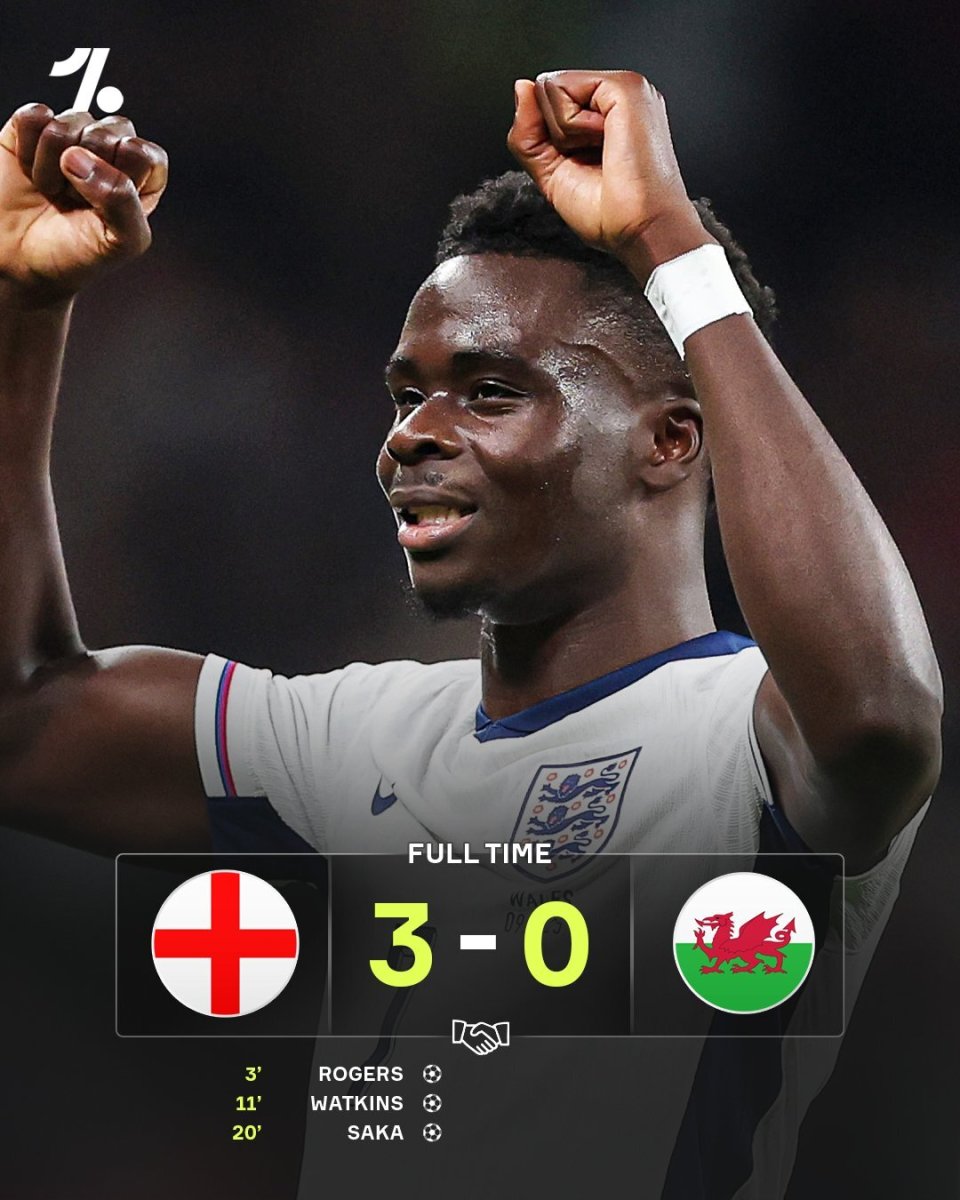 足球友谊赛,英格兰主场3-0战胜威尔士,取得3连胜。上半场罗杰斯、沃特金斯、萨卡连进三球。易边再战,双方均无建树。[详情]